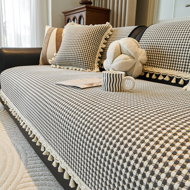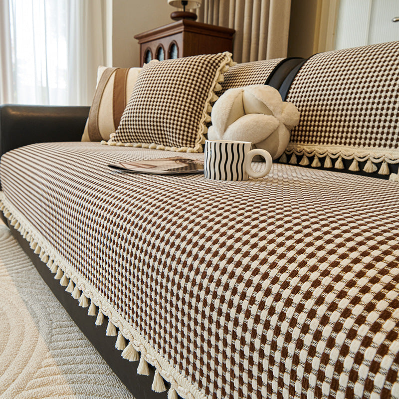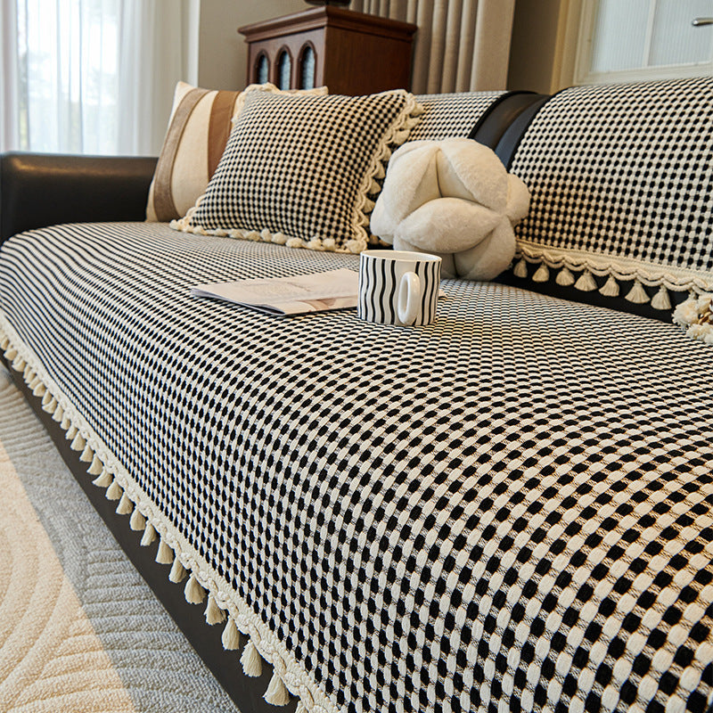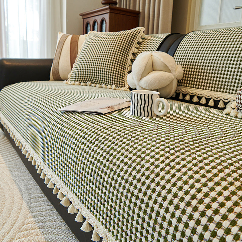 Habillez votre canapé d'une douceur et d'un charme texturés grâce à notre housse de canapé antidérapante en chenille à carreaux vichy. Son tissu chenille épais et dense, ainsi que son tissage vichy classique, offrent un confort moelleux et une touche rétro élégante, tandis que les franges à pompons apportent la touche finale.