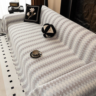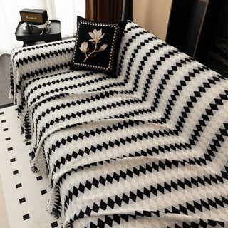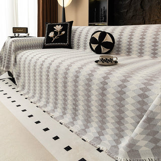 La housse de canapé Diamond Drift allie géométrie moderne et confort douillet. Tissée en fils chenille ultra-doux, elle arbore un motif de losanges saisissant qui apporte rythme visuel et élégance contemporaine à votre espace de vie. Avec sa texture riche, son drapé couvrant et ses franges subtiles, elle est à la fois fonctionnelle et élégante pour le quotidien.